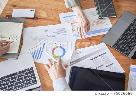 たくさんのグラフを見ながら打ち合わせをするビジネスマン
