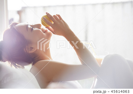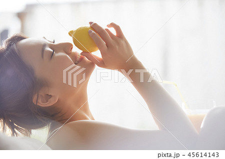 生乾きの洗濯物の匂いを嗅ぐ30代の主婦 日本人女性