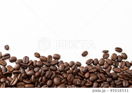こぼれたコーヒー豆とコーヒー 白バック
