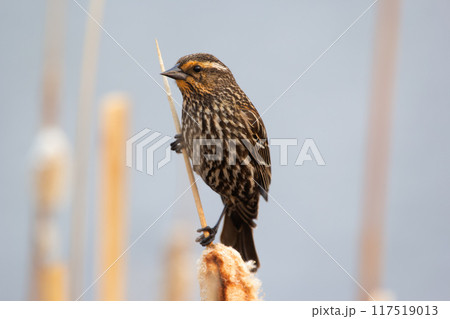 Female Red-winged blackbird is sitting on the reed near her nest during nesting season in spring at the lake.