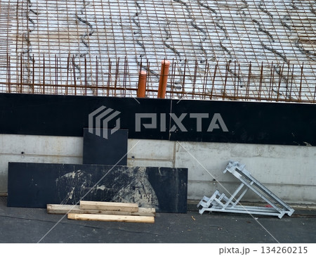 urban construction site, construction scene featuring structural elements and urban surroundings