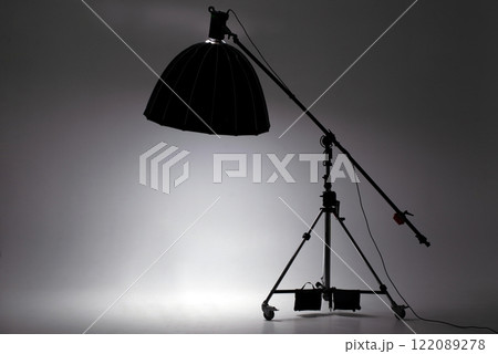 Studio lighting equipment with a large black softbox on a stand, dramatic atmosphere in a photography studio