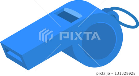 A blue whistle with a ring. The whistle has a hole to blow through and make a sound.