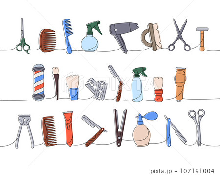 Set of barber shop tools one line colored continuous drawing. Makeup brush, hair clipper, comb, sharp razor blade, hair straightener, scissors, dryer