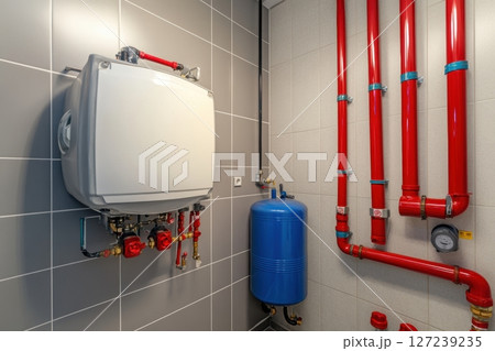 House heating system equipment. Pipelines. Basement mechanical room with condensing water heater, storage tank, plumbing systems. Plumbing service. Pipeline in boiler room. Pipes. Wall installation.