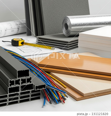Various construction materials including metal profiles, wooden boards, colorful wires, a measuring tape, and architectural plans are neatly arranged on a surface