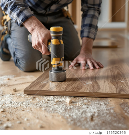 A worker drills into a wooden board on the floor, surrounded by sawdust, displaying practical skills