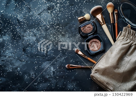 Stylish flat lay of an open makeup bag with brushes on a shimmering black glitter surface