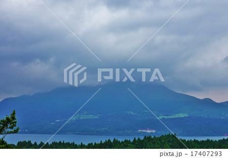 神奈川県観光スポット・芦ノ湖を隔てて、煙が雲を呼ぶ駒ヶ岳方向・横位置