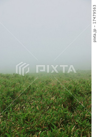 神奈川県観光スポット・箱根駒ヶ岳山頂から大涌谷方向への霧深い山肌・縦位置