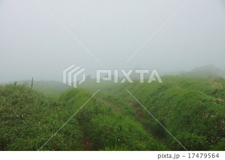 神奈川県観光スポット・箱根駒ヶ岳山頂から大涌谷への神山ハイキングコースの霧深い山道・横位置