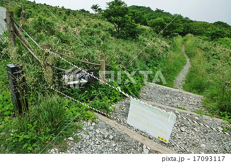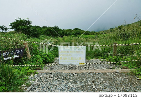 神奈川県観光スポット・箱根駒ヶ岳山頂から大涌谷方向への通行止め警告板・縦位置