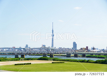 堀切橋とスカイツリー 荒川緑地公園 河川敷