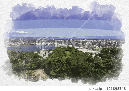 水彩画風 米子城跡 内膳丸 鳥取県米子市