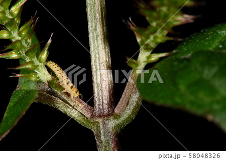 生き物 昆虫 エビイロカメムシ、七月半ばの幼虫です。真横から見るとまるで葉の一部の様です