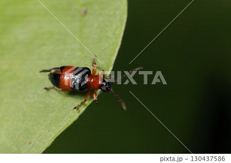 生き物 昆虫 キオビクビボソハムシ、食草はツユクサ。八月半ばの道端で