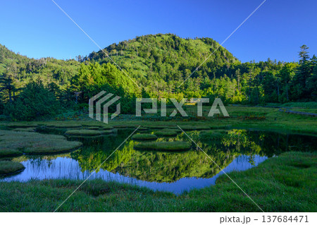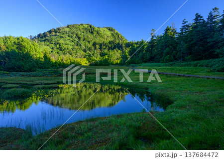 志賀高原・四十八池湿原の池塘に映る裏志賀山と青空