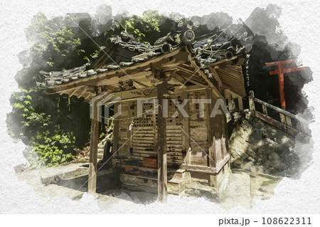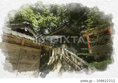水彩画風 高岡神社 伏見稲荷社 岡山県真庭市