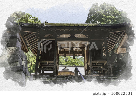 水彩画風 高岡神社 随身門 岡山県真庭市