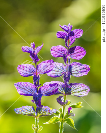 Blue Salvia farinacea flowers, or Mealy Cup Sage on green background, close-up.