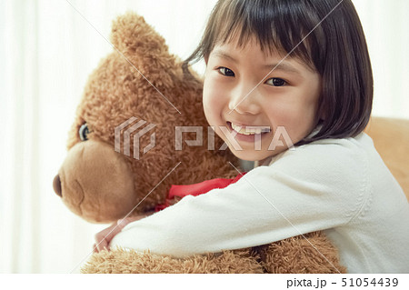 小さなクマを持ち窓際に立つ女の子