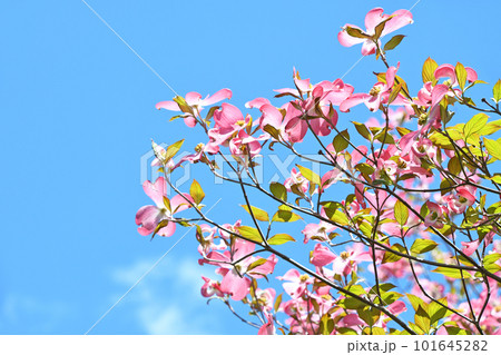 新緑の公園樹をバックにしたピンクのハナミズキ