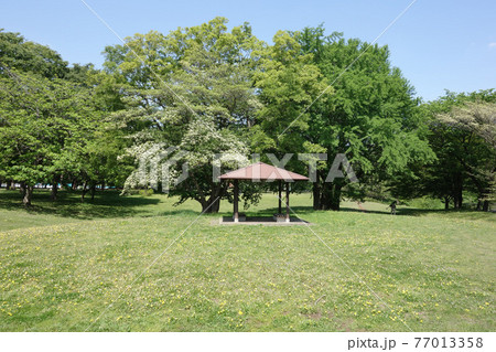 新緑の都立野川公園(ミズキの花とイチョウと東屋)