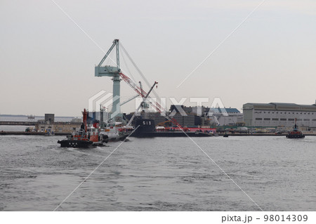 造船所で働くタグボートと海上自衛隊の潜水艦たいげい