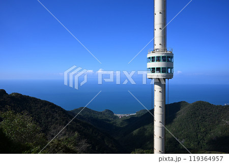 新潟県/ 弥彦山 パノラマタワーと佐渡ヶ島(珍しい回転昇降式展望塔・回転式展望台)