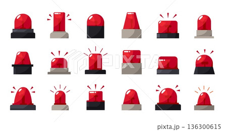 Emergency siren icons. Red beacons and alarm lights, crisis and hazard warning emoji. Glossy flashing police or ambulance signal lamp, blink flasher for urgent evacuation alert isolated vector set
