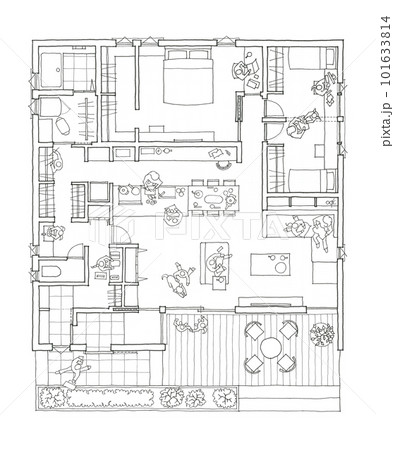 回遊家事動線・リビングテラスのある三階建て住宅の間取り(白黒)