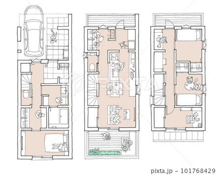 回遊家事動線・リビングテラスのある三階建て住宅の間取り(カラー)