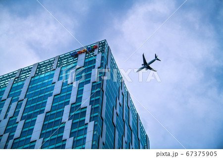 日本の東京都市景観 渋谷から望む航空機(左のビルは渋谷ストリーム)