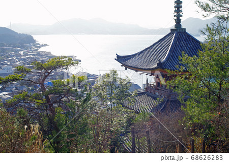 展望台から三重の塔と瀬戸内の景色