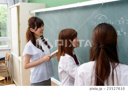 授業をする女性教師と生徒 授業風景 板書 数学 方程式