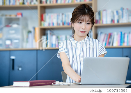 図書館でノートパソコンを使う若い女性