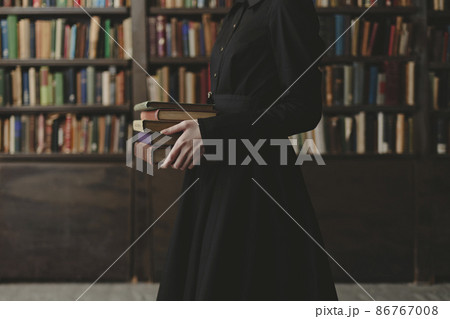 woman holds stack of books among shelves in library. student is getting education.