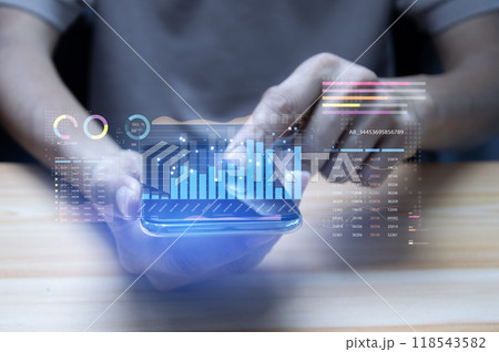 Businessman analyzing dynamic financial graphs on smartphone screen
