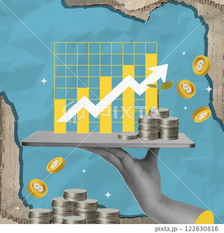 Cotemporary art collage. Hands balancing circles indicating relationship between investments and returns, emphasizing strategic resource allocation.