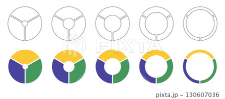 Wheels round divided, three sections. Diagrams infographic set. Circle section graph art. Pie chart icons. Donut multicolored charts, pies segmented on 3 equal parts. Geometric vector simple elements.