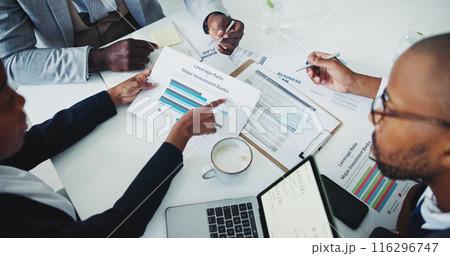 Hands, business people and team with graphs, above or circle with planning, point or banking for finance. Staff, audit and investment performance for stats, charts or revenue with paperwork in office