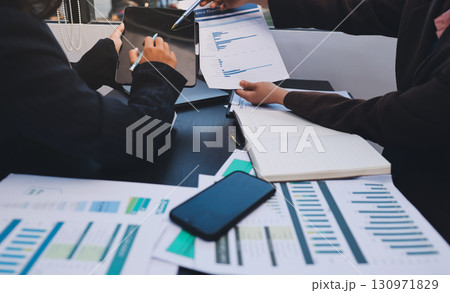 Business documents on office table with smart phone and calculator digital tablet and graph business with social network diagram and two colleagues discussing data working in the office..