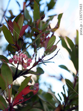 ピンク色のアセビの小花 新緑と玉ボケを背景にした春の花のクローズアップ