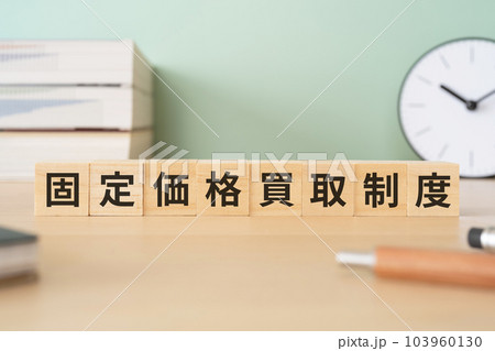 固定価格買取制度と書かれたブロックが置かれたデスク