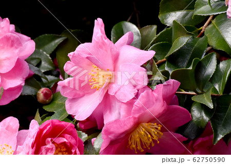 三鷹中原に咲くピンクのツバキ(カンツバキ)の花