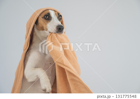 Jack Russell Terrier dog in a towel on a white background.