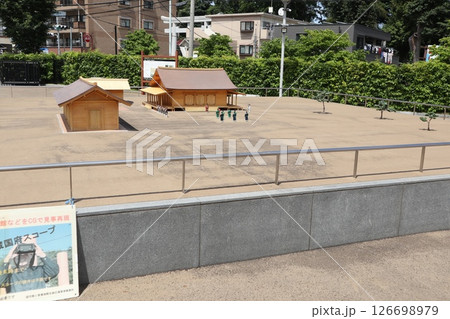 武蔵国府の国司館復元模型と建物跡に建てられた柱