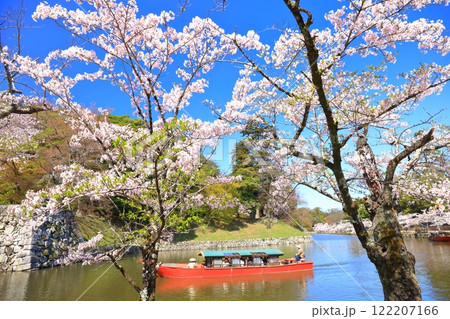 春爛漫の彦根城の内濠と屋形船