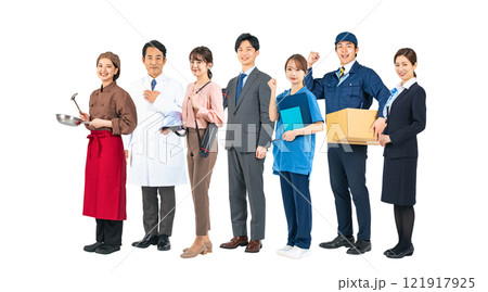 横に並ぶ様々な職業の人々のグループ 手作業で精密に切り抜いた背景透過全身写真PNG