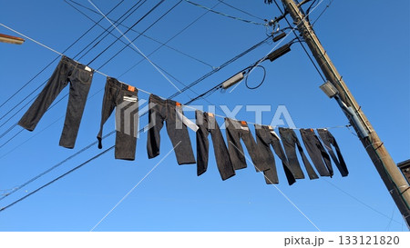 児島ジーンズストリートの吊されたデニムを大きく撮ってみる